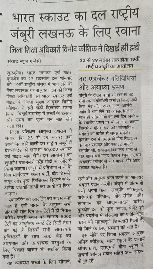 विद्यालय से भारत स्काउट गाइड का दल राष्ट्रीय जंबूरी लखनऊ के लिए रवाना।। blog engineering notices post post Uncategorized November 23, 2025November 23, 2025 Om Parkash ParkashLeave a Comment on विद्यालय से भारत स्काउट गाइड का दल राष्ट्रीय जंबूरी लखनऊ के लिए रवाना।।