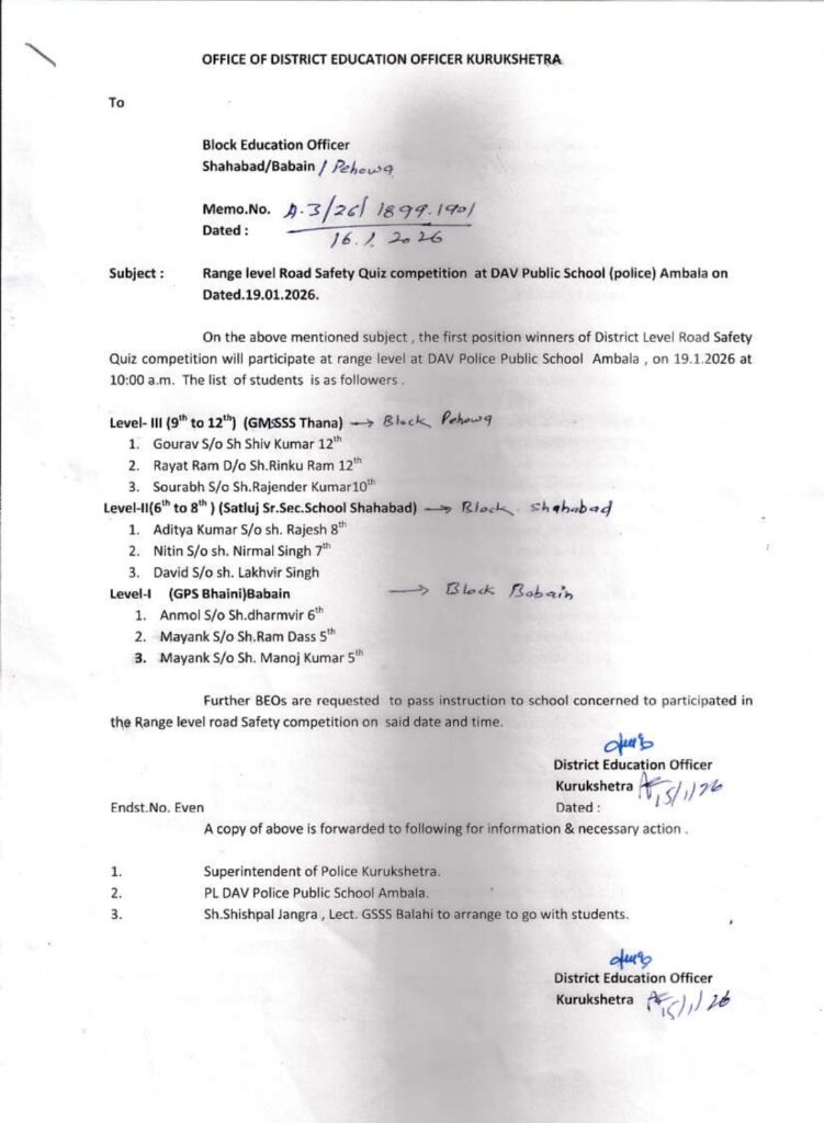 On the above mentioned subject, the first position winners of District Level Road Safety Quiz competition will participate at range level at DAV Police Public School Ambala, on 19.1.2026 at 10:00 a.m. The list of students is as followers.